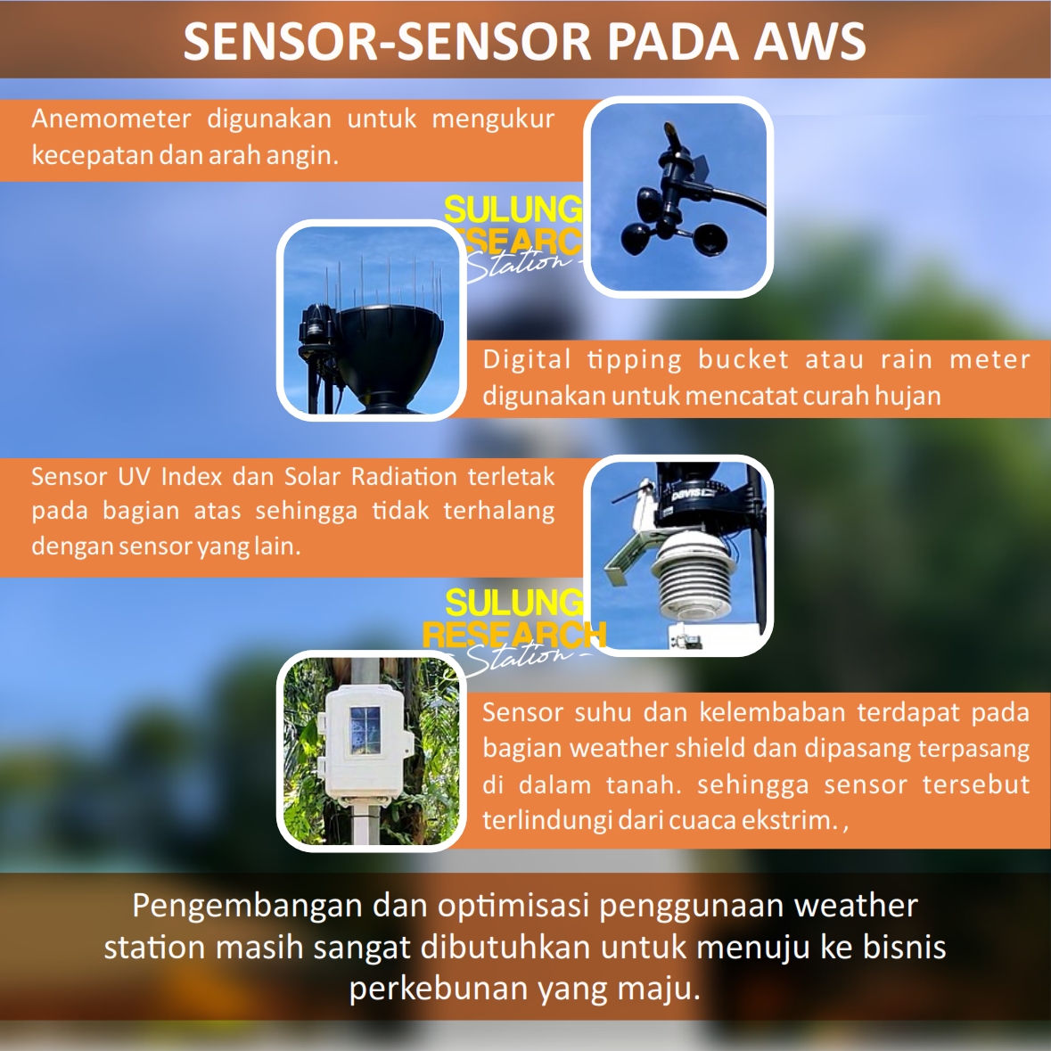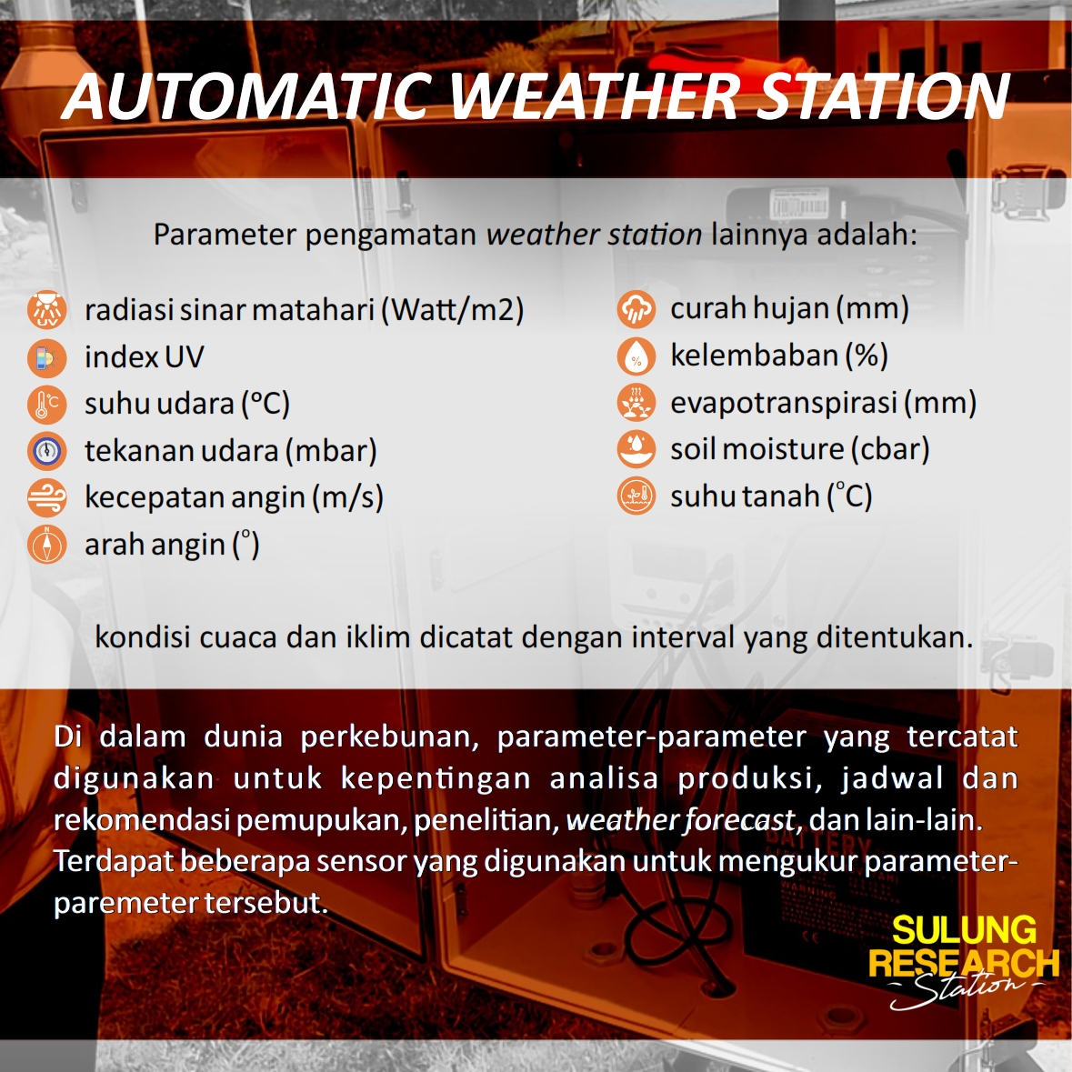 Automatic Weather Station merupakan salah satu alat yang berfungsi untuk melakukan pencatatan dan pengukuran kondisi cuaca dan iklim sehingga dapat dilakukan penyusunan kegiatan perkebunan dengan tepat.