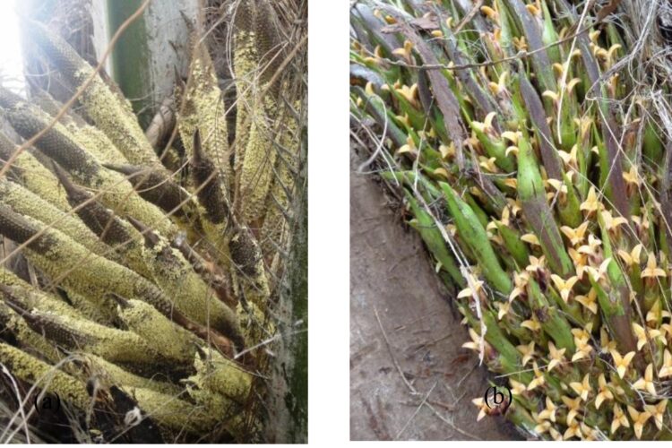 Bunga jantan memiliki ciri berwarna kuning muda, pada permukaan spikelet yang mekar (anthesis) banyak terdapat serbuk sari berukuran kecil dari bagian pangkal ke bagian ujung tandan bunga jantan (Gambar 1a) dan mengeluarkan aroma khas yang menjadi atractant bagi kumbang E. kamerunicus . Setiap bunga jantan rata-rata dapat menghasilkan serbuk sari atau polen sekitar 40 gram/tandan (Prince et al. 2007). Masa bunga jantan anthesis dapat berlangsung selama 4-5 hari dengan periode pelepasan serbuk sari berlangsung selama 2-3 hari. Serbuk sari pada bunga mengeluarkan bau seperti adas yang sangat kuat, dan jauh lebih kuat dari bau bunga betina (Kee, et al. 2008).