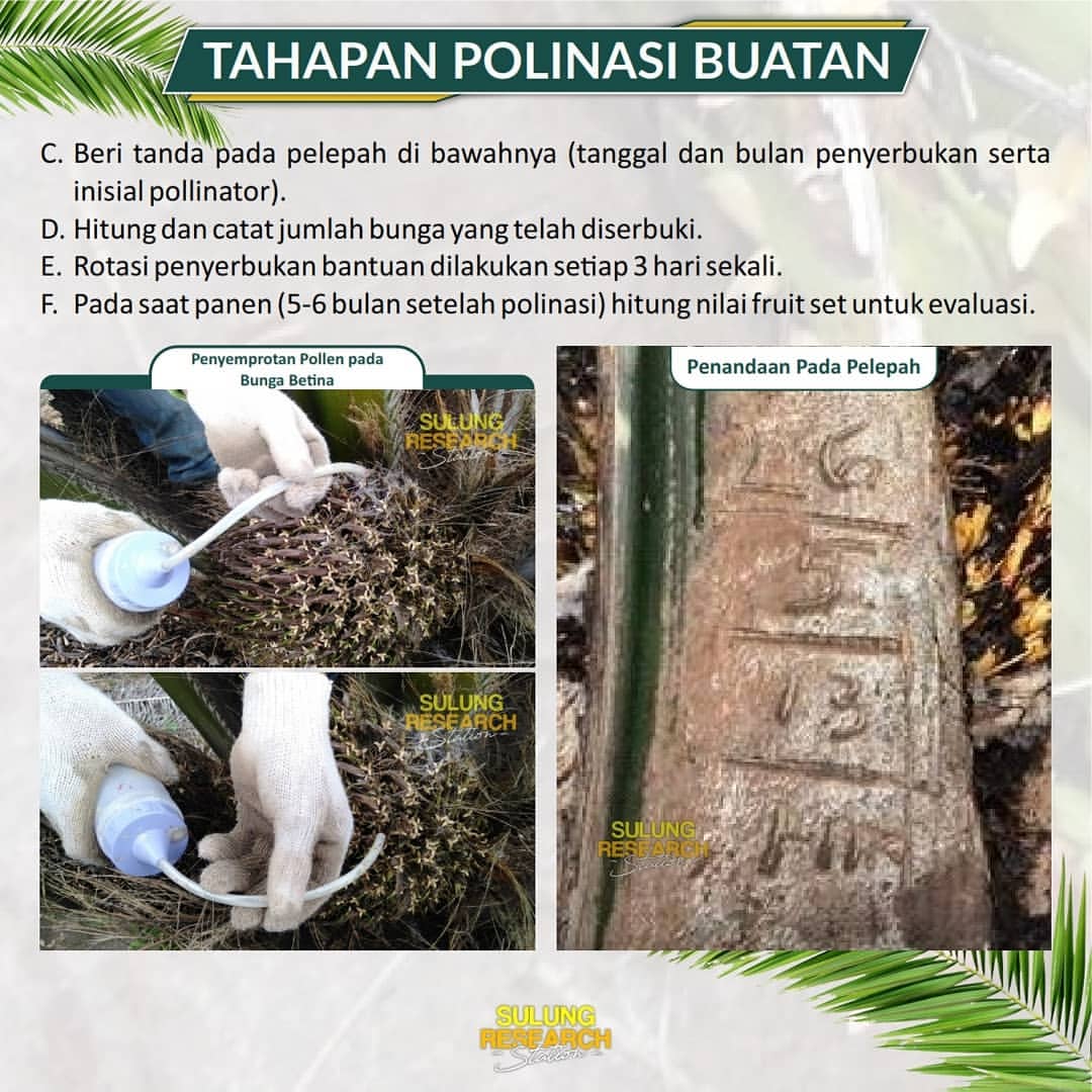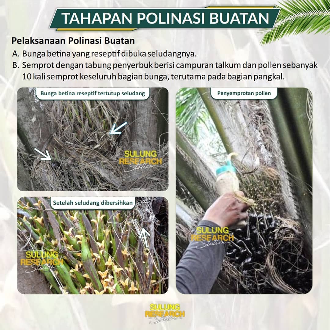 Pelaksanaan polinasi buatan/hand polination dengan cara menyemprotkan tabung berisi campuran talkum dan pollen keseluruh bagian bunga, terutama pada bagian pangkal.