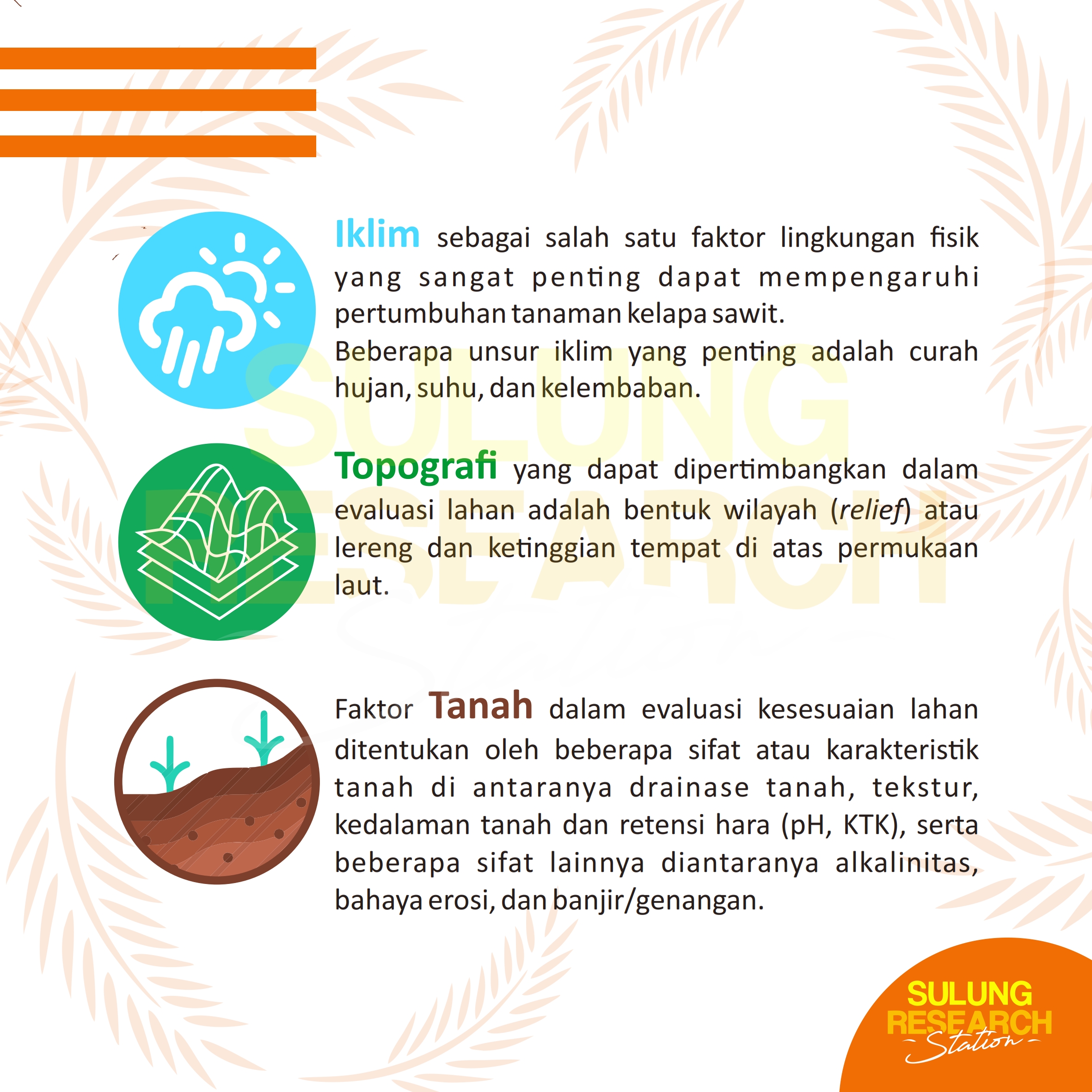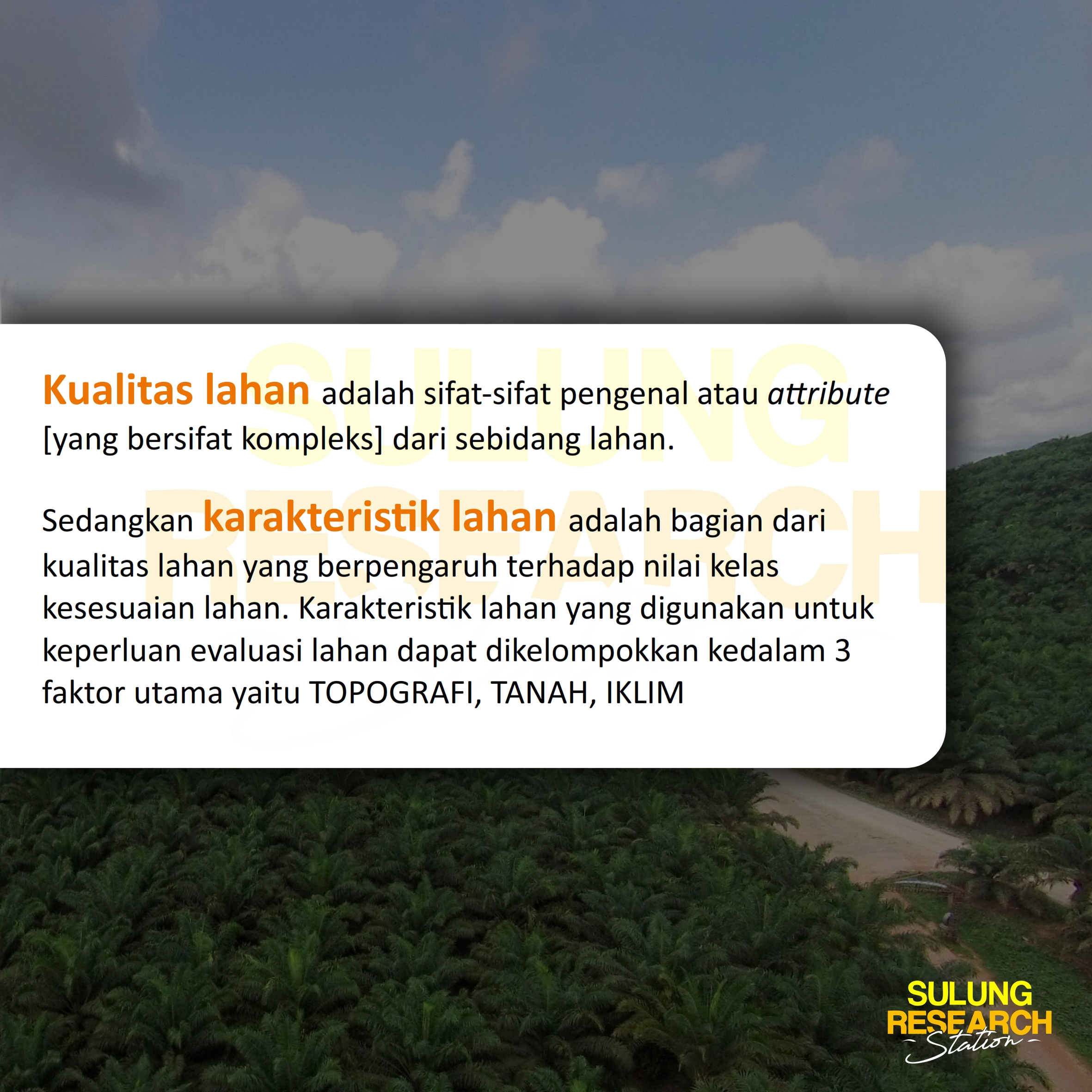 March 7, 2020 by aan in POST KUALITAS DAN KARAKTERISTIK LAHAN 1 2 3 4 5 Kualitas lahan adalah sifat-sifat pengenal atau attributeĀ [ yang bersifat kompleks ] dari sebidang lahan. Sedangkan Karakteristik lahan adalah bagian dari kualitas lahan yang berpengaruh terhadap nilai kelas kesesuaian lahan. Tags #karakteristiklahan citraborneo palmoil sulungresearchstation Share previous post Leaf Area Index (LAI) next post SHORT TRAINING