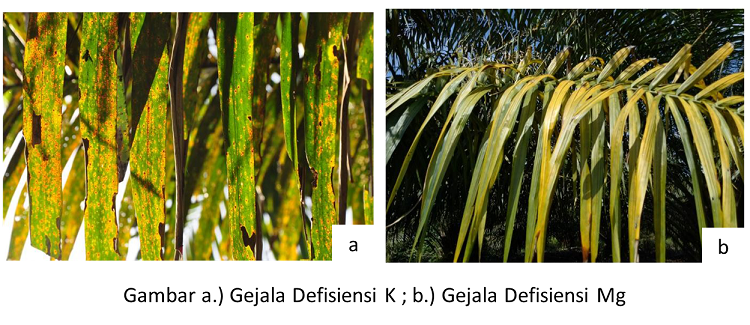 Defisiensi erat kaitannya dengan kesehatan tanaman, dimana secara visual tanaman menunjukkan kondisi kekurangan unsur hara baik secara makro ataupun mikro. Praktisi pengelola perkebunan kelapa sawit penting untuk mengetahui gejala tanaman yang mengalami kekurangan unsur hara seperti defisiensi K dan Mg. Mengapa demikian? Karena tanaman yang mengalami defisiensi tersebut secara kasat mata hampir memiliki kesamaan ciri. Namun, jika diperhatikan antara defisiensi K dan Mg memiliki perbedaan gejala yang cukup berbeda.