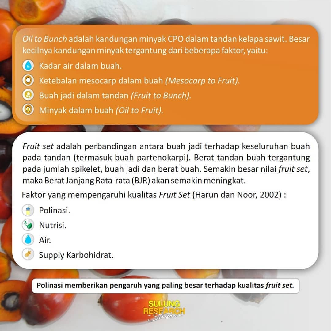 Oil to Bunch adalah kandungan minyak kelapa sawit, sementara Fruit Set adalah perbandingan antara buah jadi terhadap keseluruhan buah pada tandan (termasuk buah partenokarpi).