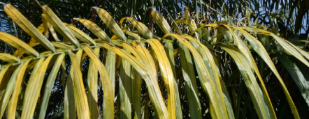 Defisiensi Mg pada kelapa sawit umumnya ditandai oleh gejala klorosis pada anak daun yang terpapar langsung sinar matahari, sementara bagian daun yang terlindung tetap berwarna hijau. Gejala ini biasanya muncul terlebih dahulu pada daun tua dan pada tahap lanjut dapat menyebabkan pengeringan (nekrosis). Kekurangan Mg dapat terjadi akibat rendahnya ketersediaan hara ini di tanah. Selain itu, sifat antagonis Mg terhadap kalium (K) dan kalsium (Ca) juga memengaruhi penyerapannya. Perbandingan unsur K/Ca/Mg yang seimbang menjadi kunci ketersediaan optimal, dengan rasio terbaik sebesar 10/30/60 (Sukarji et al., 2000). Tingginya curah hujan juga berkontribusi terhadap defisiensi Mg, karena unsur ini mudah tercuci dari tanah (Rankine & Fairhurst, 1999).