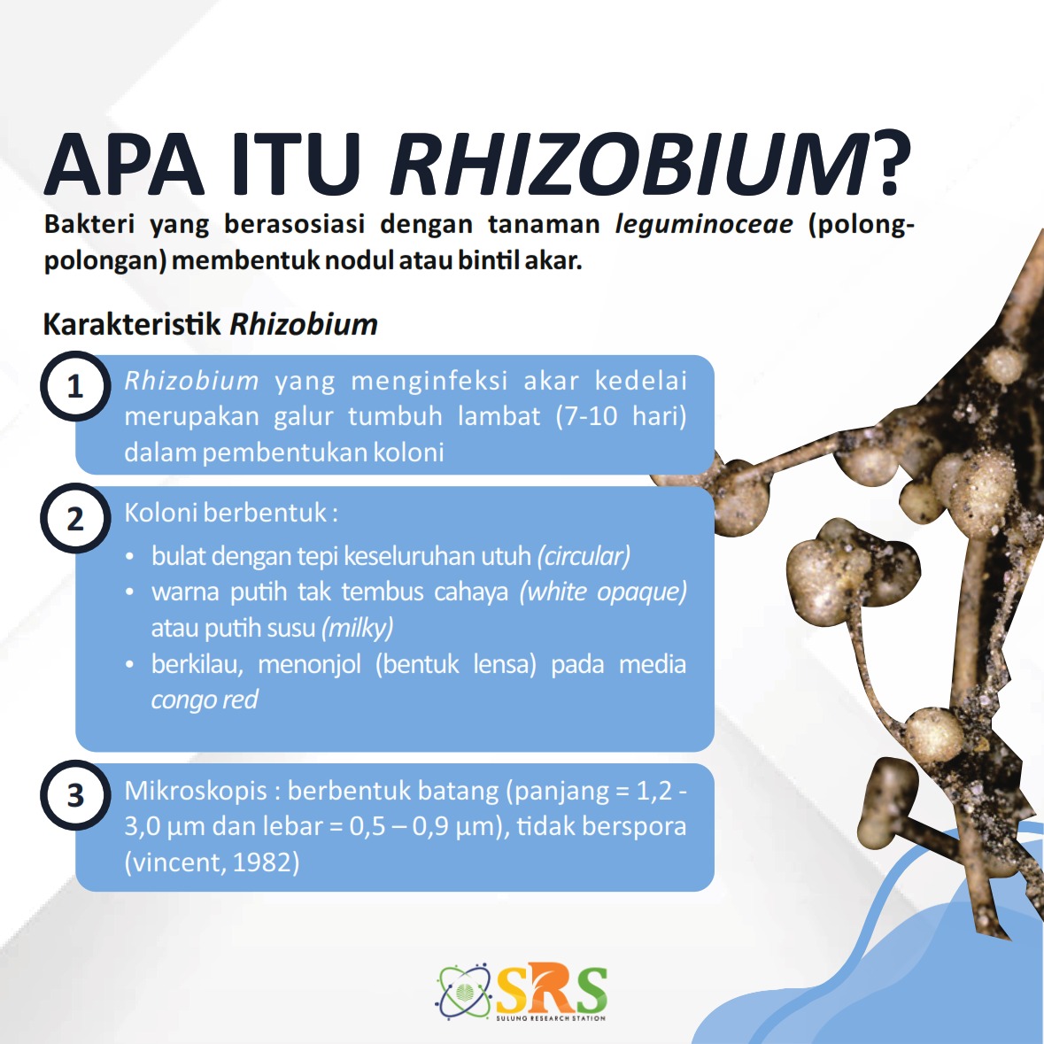 Rhizobium merupakan bakteri yang berasosiasi dengan tanaman leguminoceae (polong-polongan) membentuk nodul atau bintil akar.