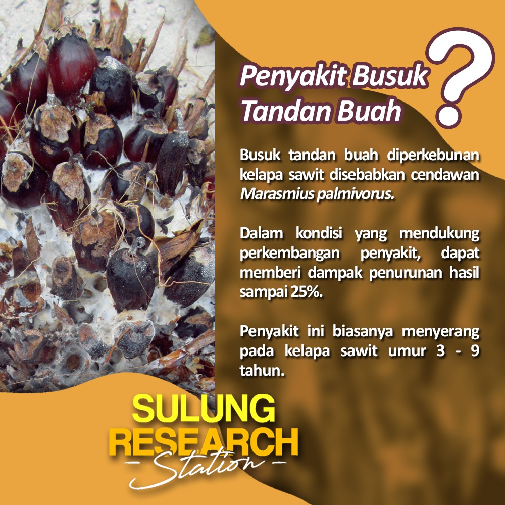 Busuk tandan buah diperkebunan kelapa sawit disebabkan oleh Marasmius palmivorus. Penyakit ini dapat serius karena jika kondisi lingkungan mendukung untuk berkembang penyakit ini dapat menurunkan hasil sampai 25%. Penyakit ini biasanya menyerang pada kelapa sawit umur 3-9 tahun.