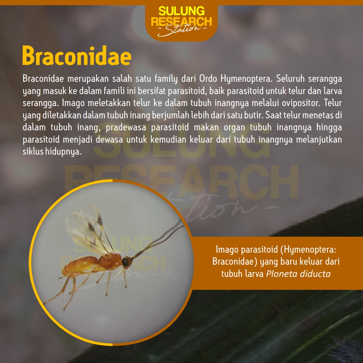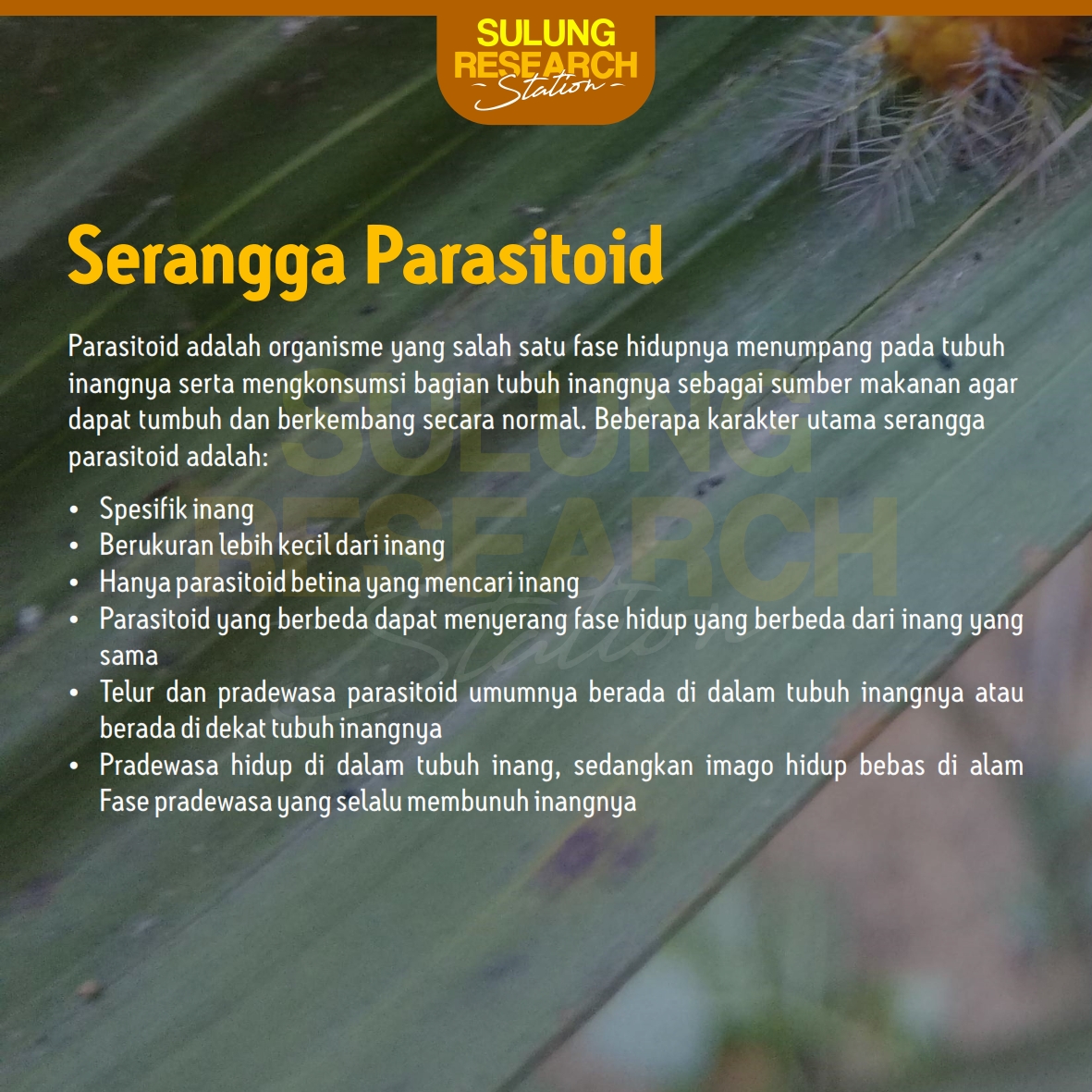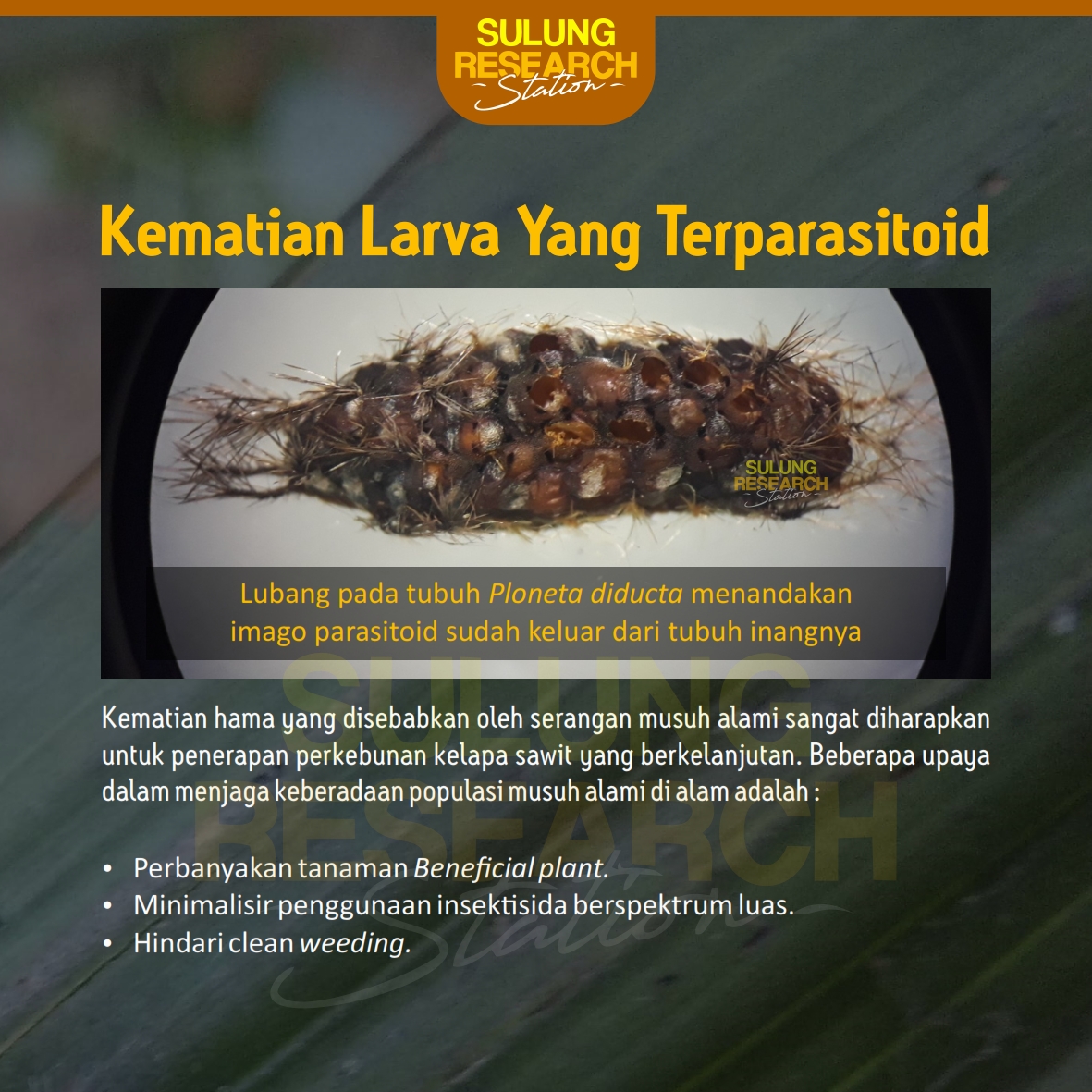 February 1, 2020 by aan in POST(english) SERANGGA PARASITOID 1 2 3 4 5 6 7 Parasitoid adalah organisme yang salah satu fase hidupnya menumpang pada tubuh inangnya serta mengkonsumsi bagian tubuh inangnya sebagai sumber makanan agar dapat tumbuh dan berkembang secara normal. Tags #CBI #seranggaparasit #sulungresearch palmoil Share previous post TURNERA SUBULATA next post Bakteri Penambat Nitrogen SIMBIOTIK
