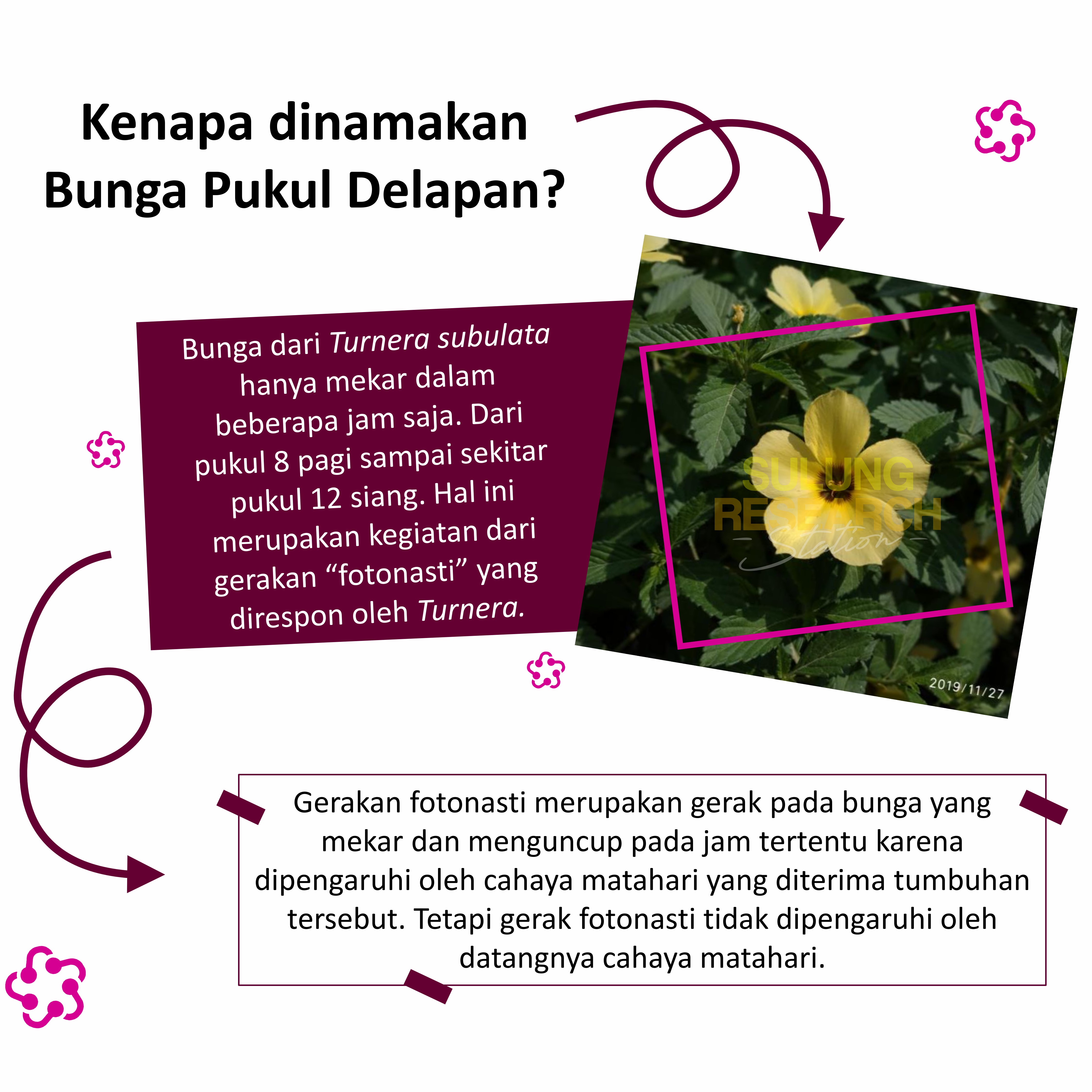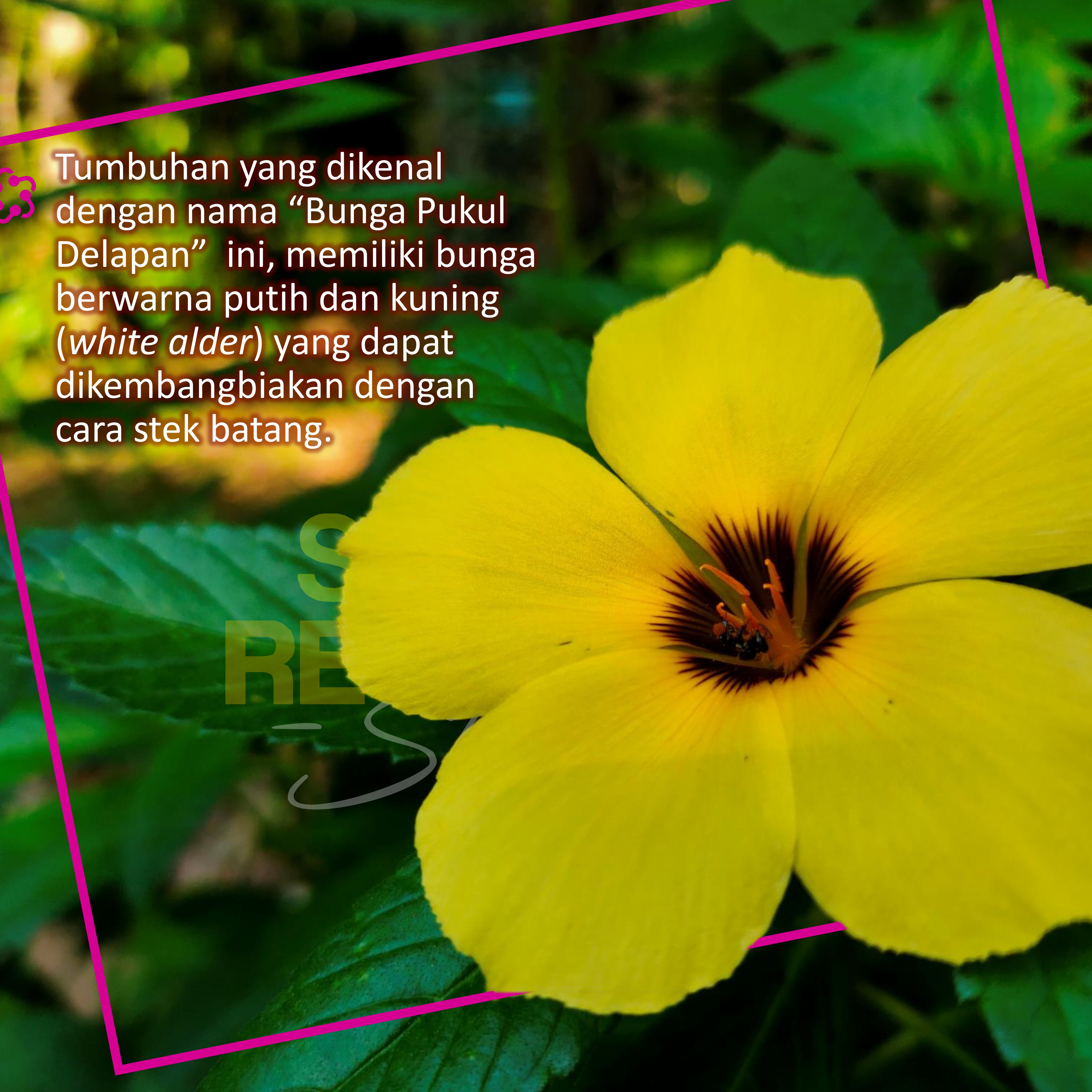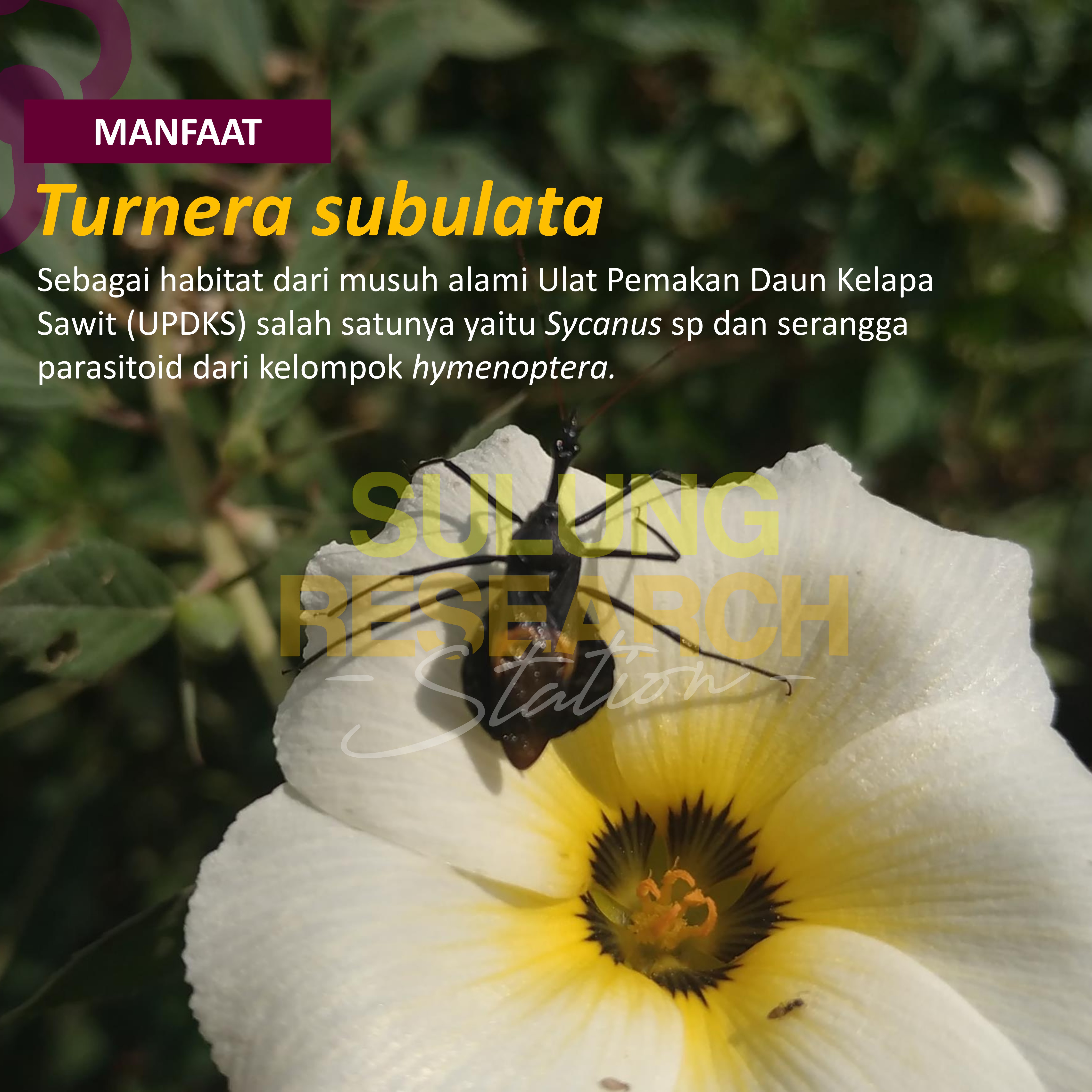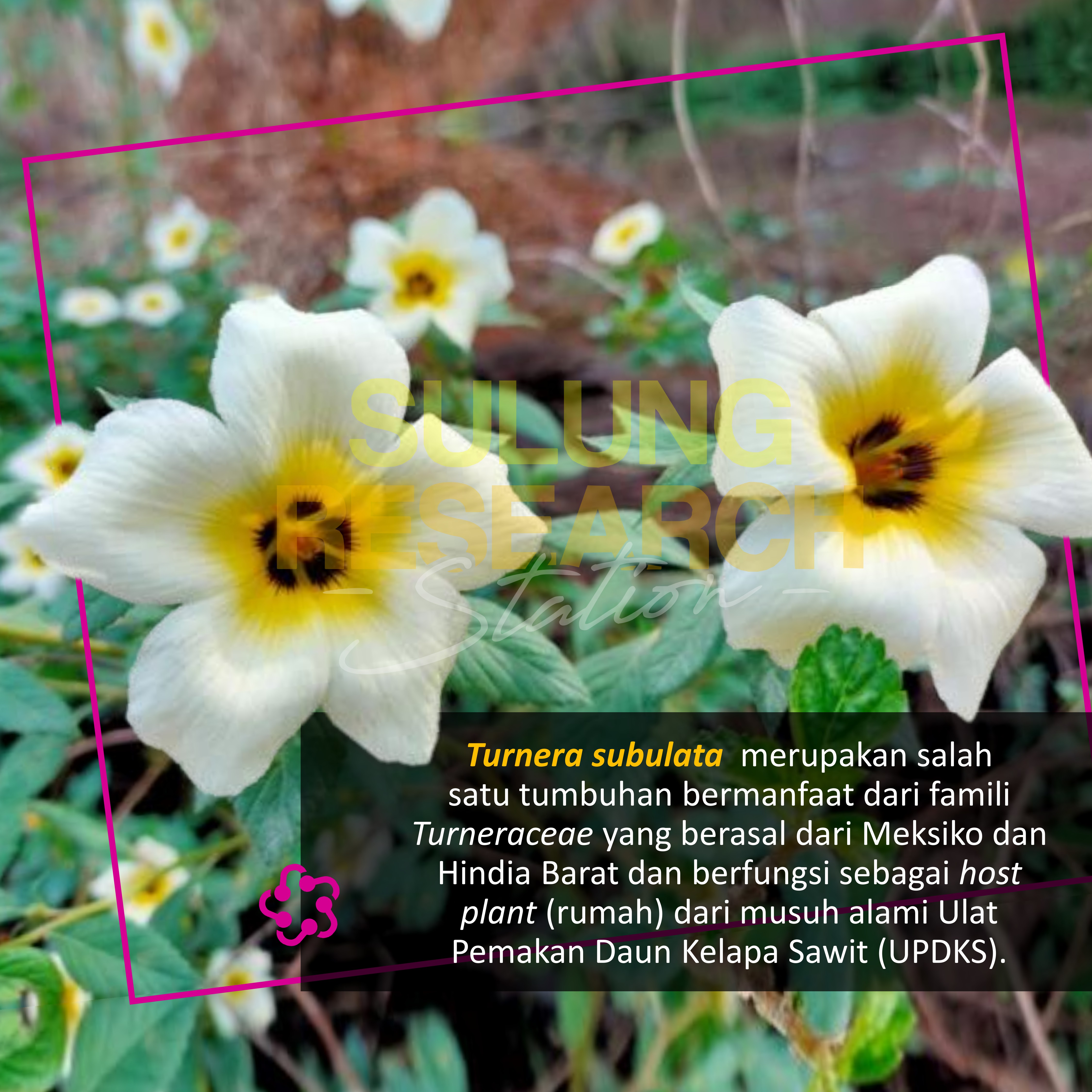 January 20, 2020 by aan in POST(english) TURNERA SUBULATA 1 2 3 4 5 6 7 8 TURNERA SUBULATA Turnera subulata merupakan salah satu tumbuhan bermanfaat dan berfungsi sebagai host plant dari musuh alami ulat pemakan daun kelapa sawit. Bunga ini juga dikenal dengan nama bunga pukul delapan. Tags citraborneo indonesiamaju sawitbaik sumbermasarana Share previous post Water Management next post SERANGGA PARASITOID